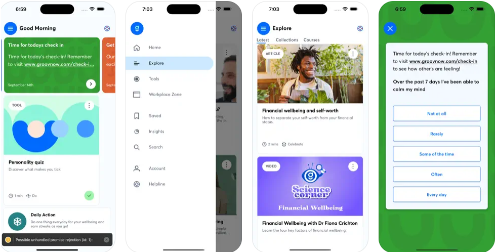 Groov app provides information, activities and videos about mental and emotional wellbeing. It incorporates a mix of scientifically sound information, personal story videos, and practical advice on practices that can help build resilience and cope with stress. It is not designed to be treatment for significant mental health problems, but to prevent them and help support self-care and wellness. For the complete app description, go to the App website(external link), Google Play(external link) and the App Store(external link), or for a more detailed review, see reviews below.