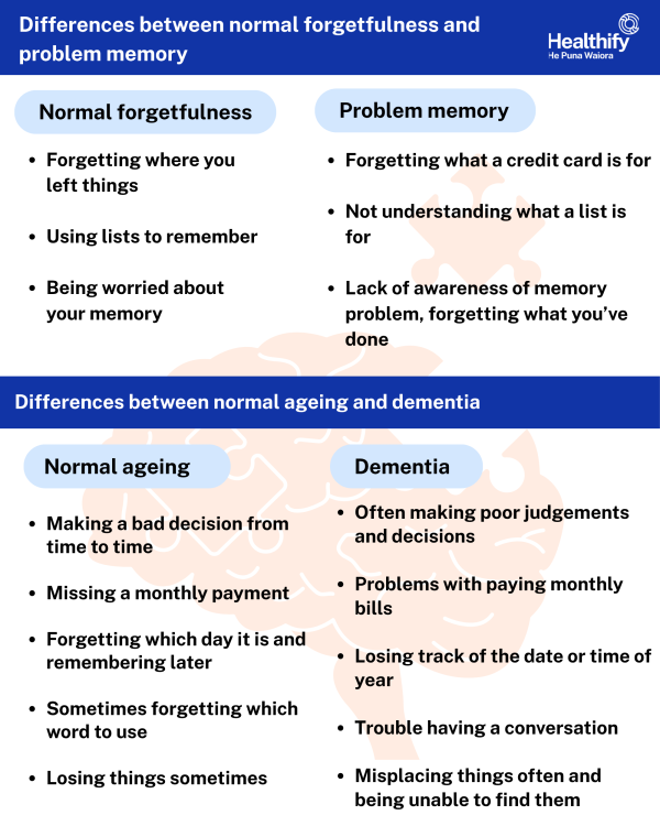 While you, your whānau or close friends will be aware of this decline in your memory or thinking, unlike people who have dementia, you can still be independent in your daily life.