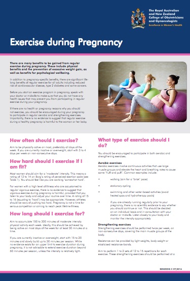 Exercise during pregnancy(external link) Royal Australian and New Zealand College of Obstetricians and Gynaecologists, 2016