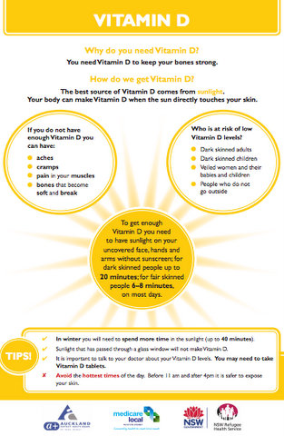 Vitamin D – factsheet [PDF, 235 KB] Refugee Health Network and Auckland District Health Board, NZ English [PDF, 235 KB], Amharic [PDF, 313 KB], Arabic [PDF, 366 KB], Burmese [PDF, 290 KB], Somali [PDF, 256 KB]